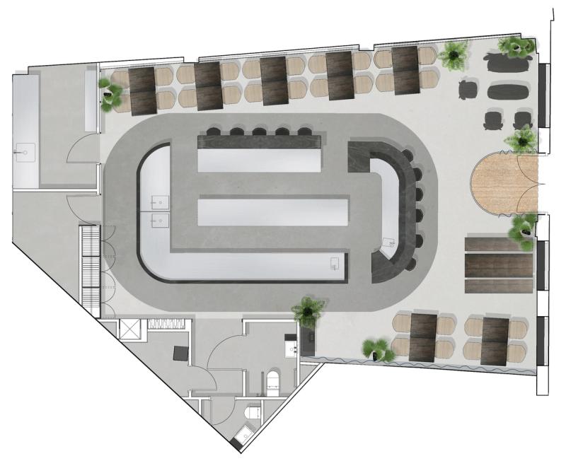 The concept is focused around Tom - the kitchen is, therefore, the central feature of the restaurant, conceived as a stage, with the tables arranged as a theatre-in-the-round. The cooking process is experienced as a performance, with every diner enjoying a view of Tom and his team preparing their food.