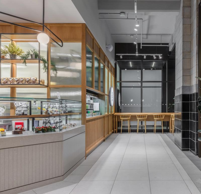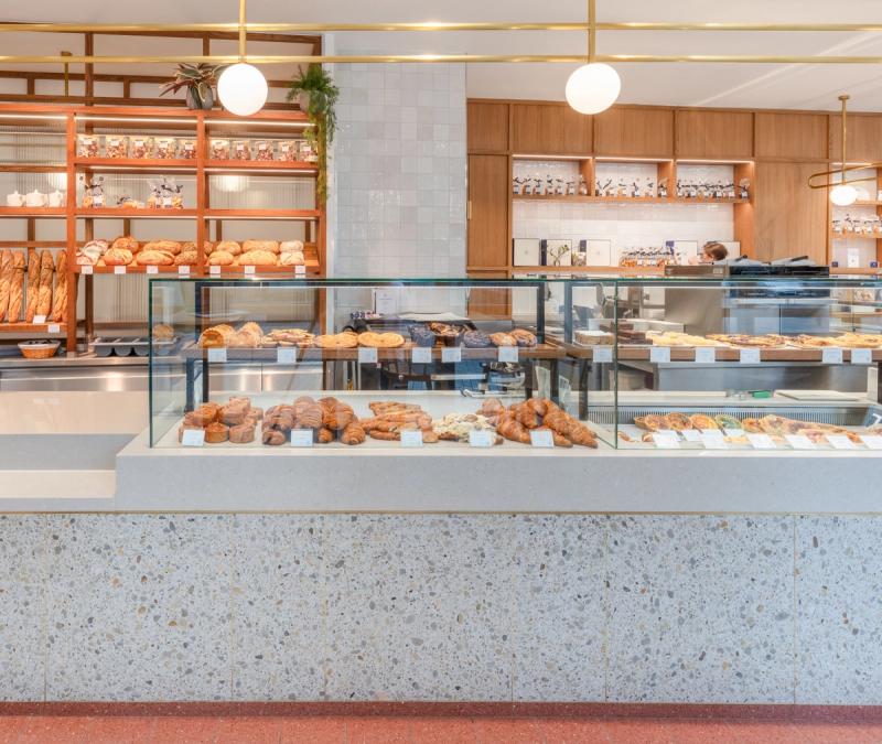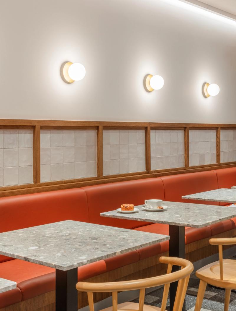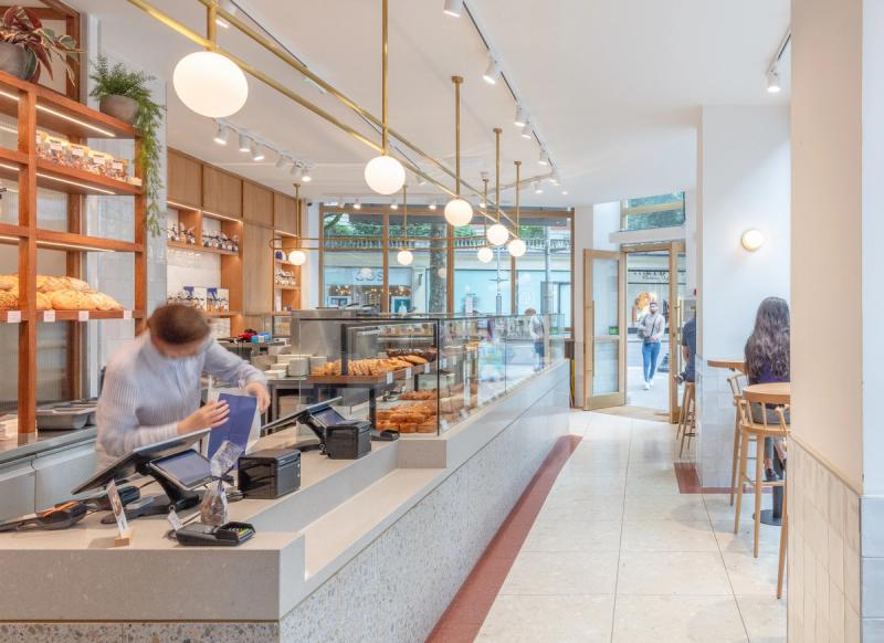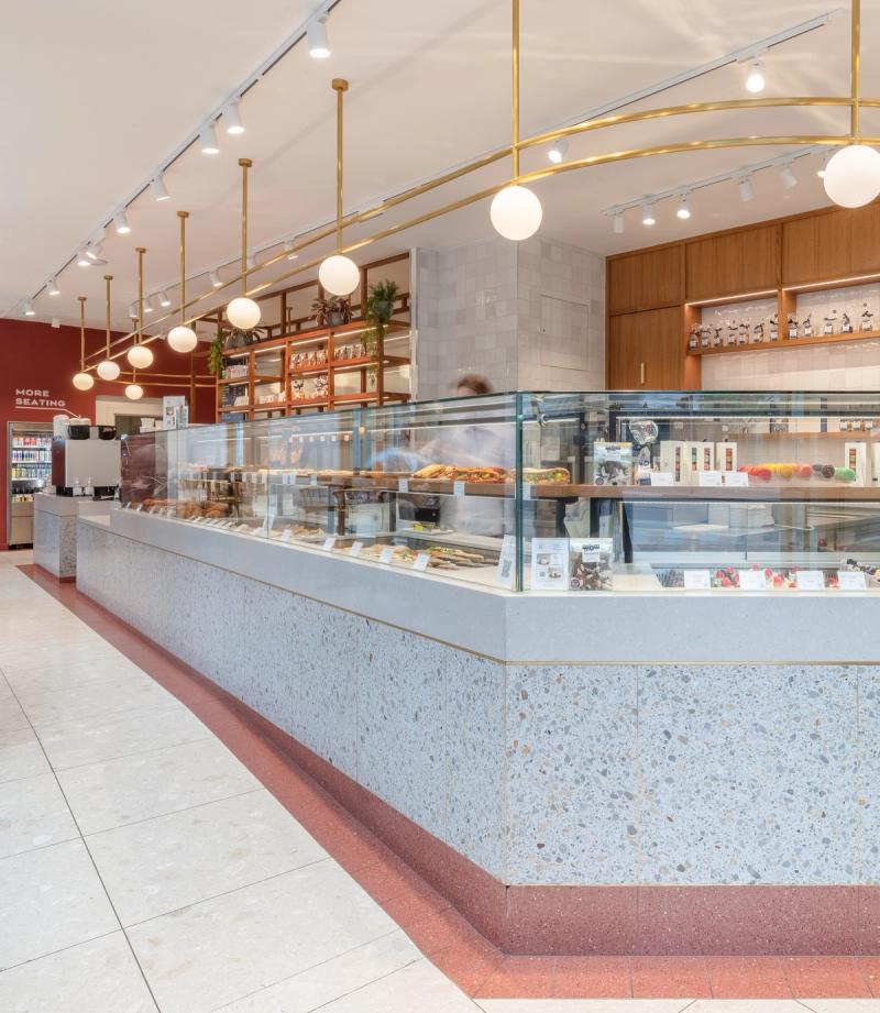 At both sites we looked to celebrate the on-site production and skilled art of the patisserie process, providing a visual connection to the bakery and cake finishing room through a back-lit glazed screen, enhancing the experience and creating a dialogue between the customer and the production process.
