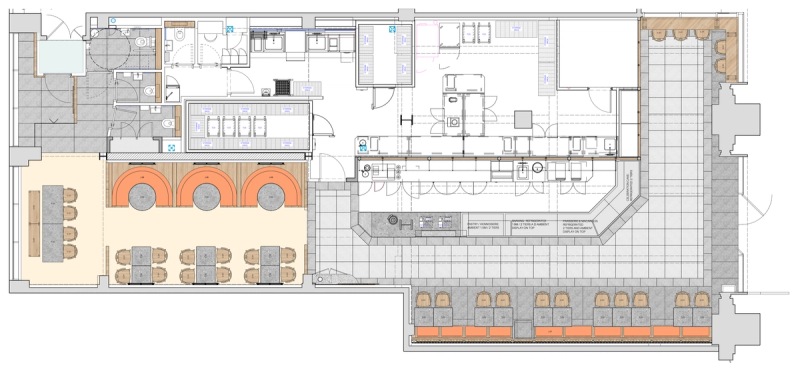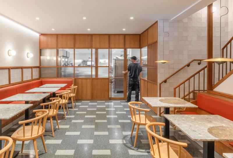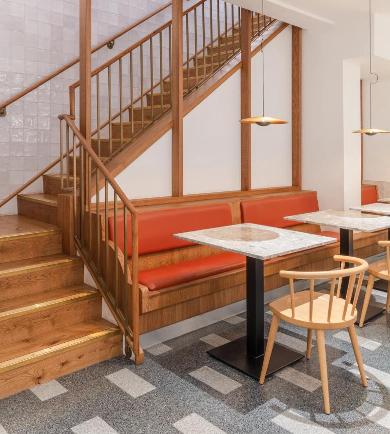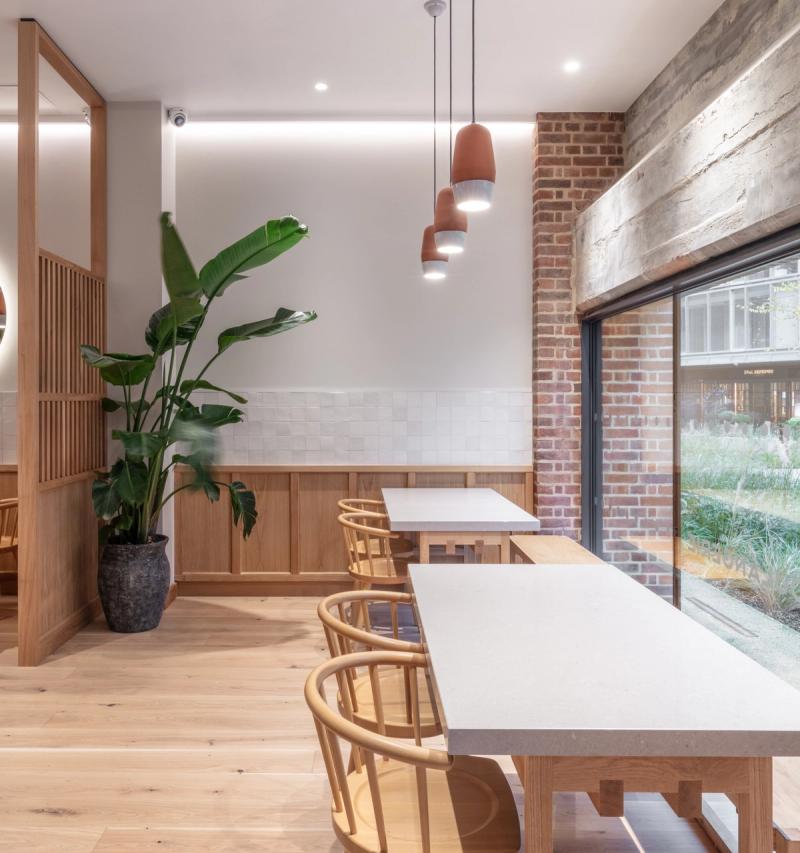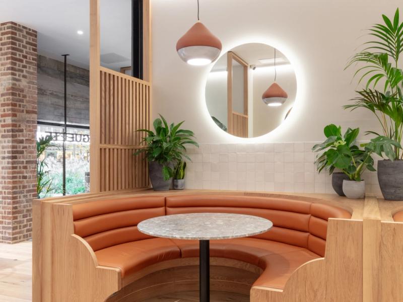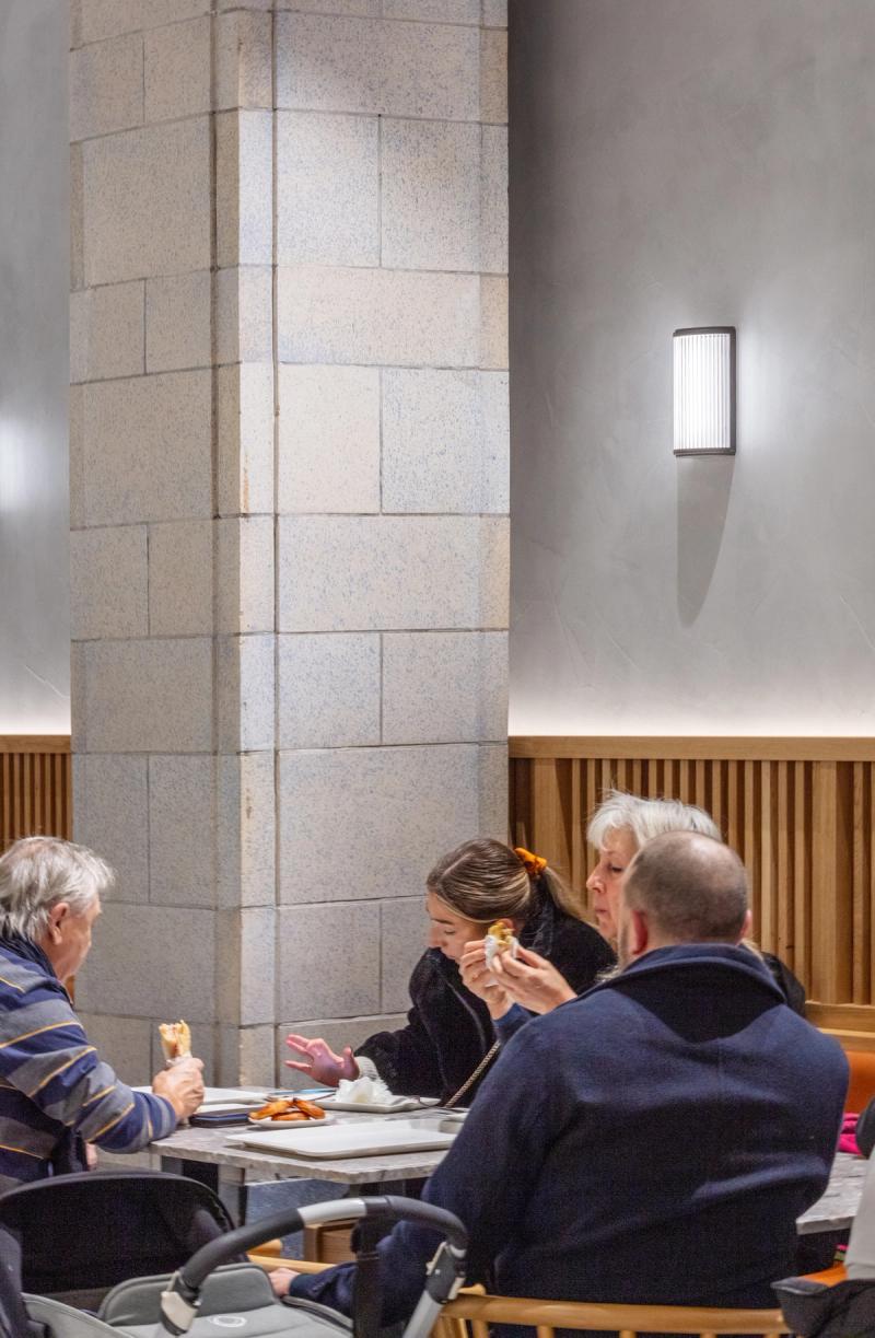 At both sites we looked to celebrate the on-site production and skilled art of the patisserie process, providing a visual connection to the bakery and cake finishing room through a back-lit glazed screen, enhancing the experience and creating a dialogue between the customer and the production process.